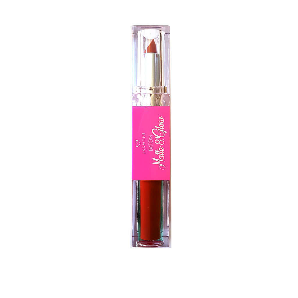 O Batom Duo Matte e Glow da Jasmyne possui em uma ponta o batom bastão Matte e na outra ponta o batom líquido Glow, embalagem com espelho.