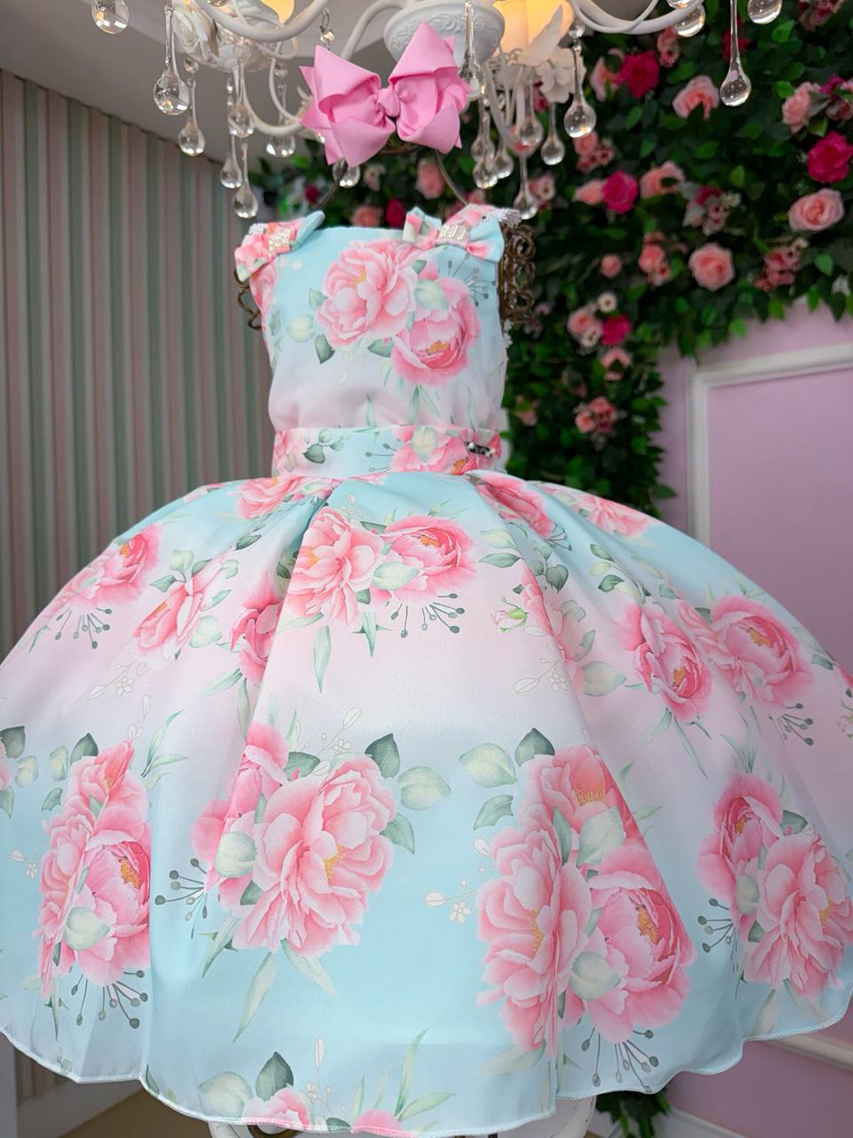 O vestido Lorena é pura delicadeza, com estampa floral em tons de rosa suave sobre fundo azul bebê, criando um visual romântico e sofisticado. As alcinhas com laços decorados com pérolas dão um charme especial, enquanto o lindo laço nas costas garante um acabamento perfeito e encantador.
